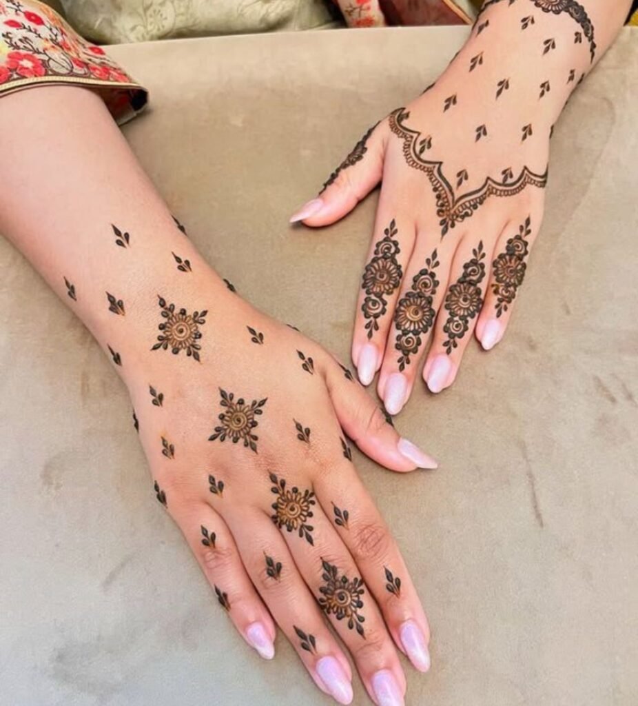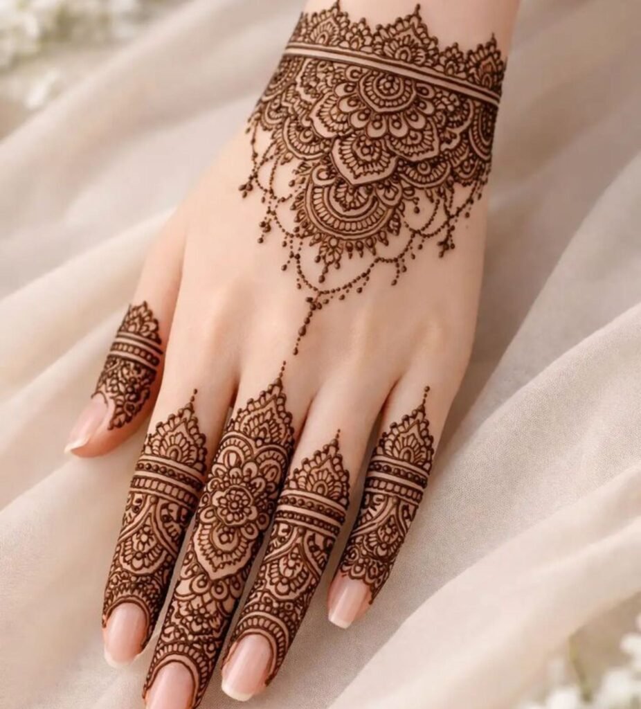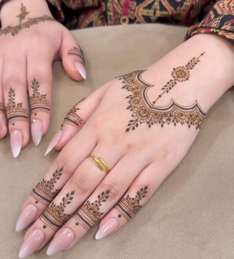 The palm stays nearly bare, which makes the fingers look even bolder. It’s the henna equivalent of wearing statement rings and nothing else.