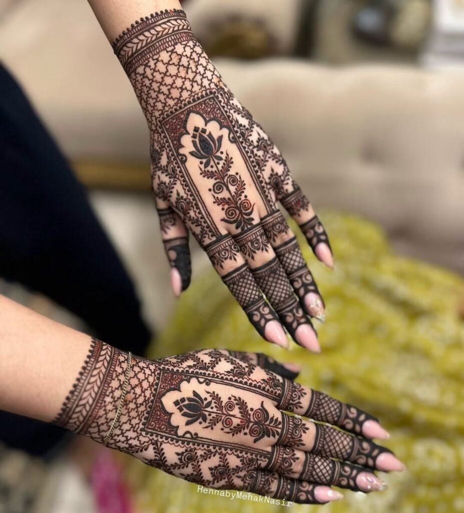 When Kuchi jewelry motifs were translated into henna the thick borders, the angular flowers, the stacked geometric bands they created what artists now call “Skin Jewelry.” The henna doesn’t decorate the hand. It becomes an accessory. That concept is exactly what’s driving the 2026 henna trend.