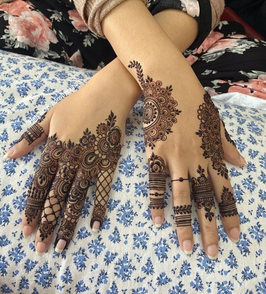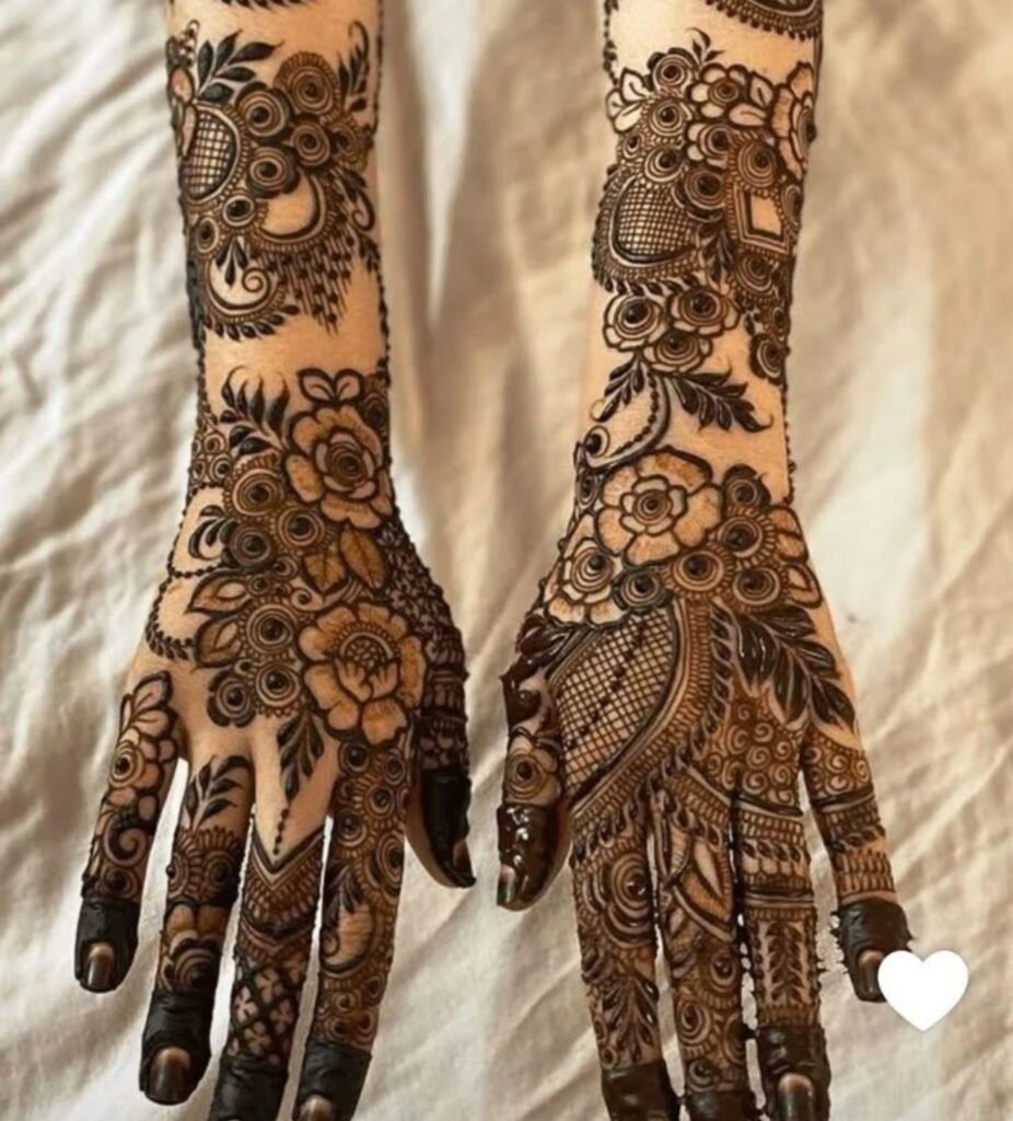For bridal occasions, Arabic Mehndi Design has evolved into something truly spectacular: the fusion style. This technique blends Arabic bold outlines with the intricate inner fillings of Indian mehndi. The result is a breathtaking design that beautifully covers not just the hands but also the arms and feet.