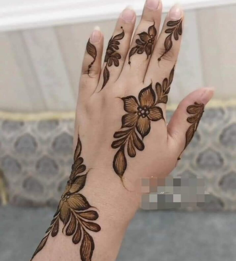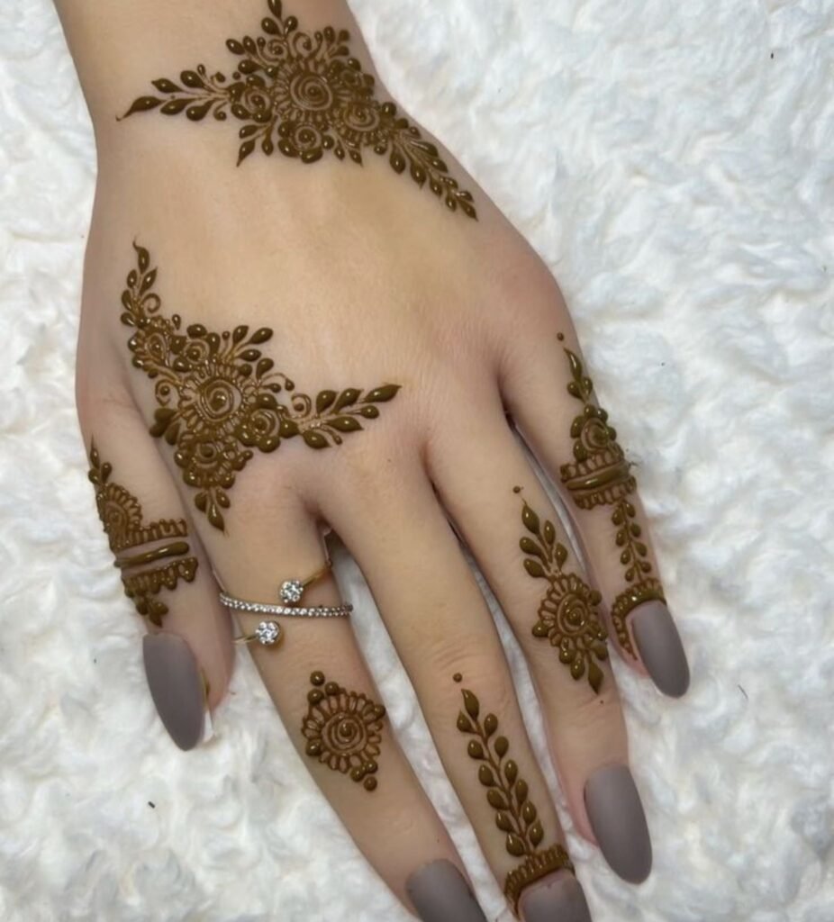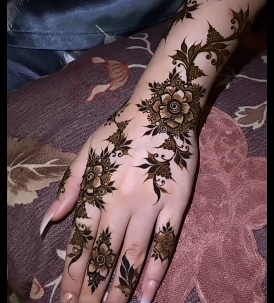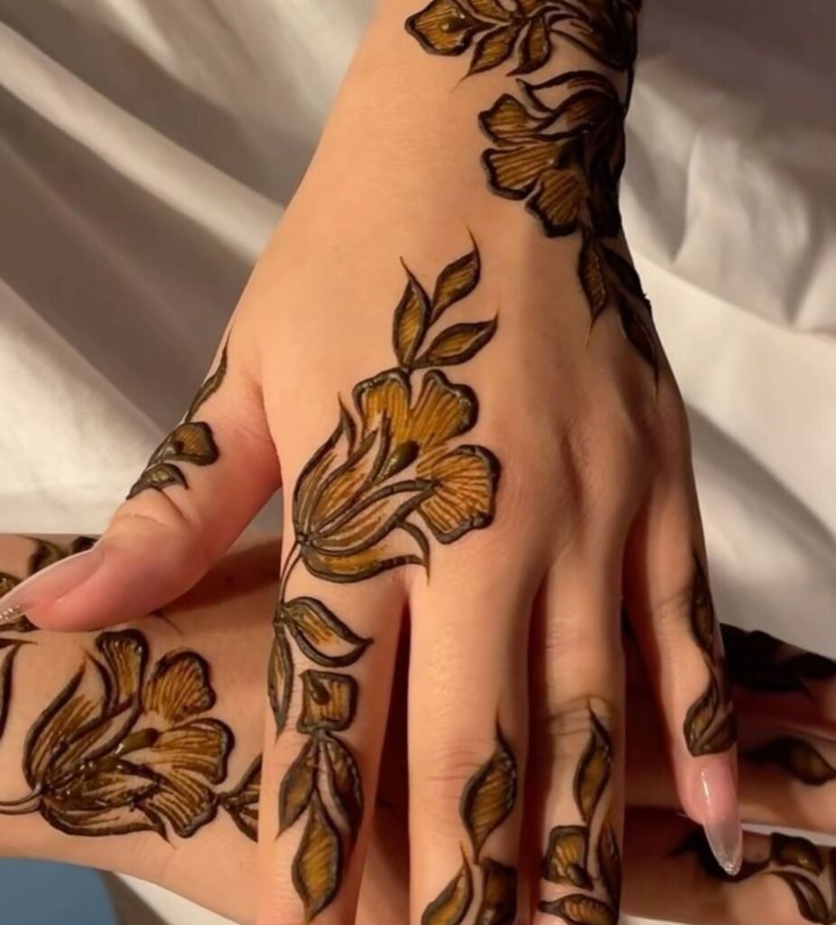 Floral motifs are the soul of Arabic henna. These patterns feature large, boldly outlined flowers with soft petal trails that transform your hands into a living canvas. What makes floral Arabic patterns special is the deliberate use of open skin space between each motif, giving the design room to breathe and stand out beautifully.