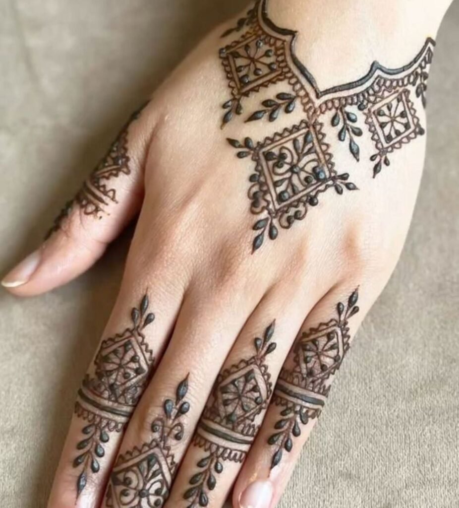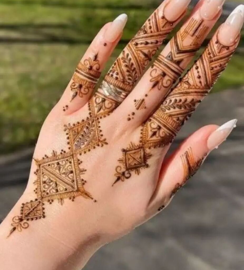 Geometric Arabic mehndi uses sharp triangles, hexagons, and diamond shapes to create structured and symmetrical art on your hands. While unconventional, this style is rapidly gaining popularity among modern mehndi lovers in 2026.