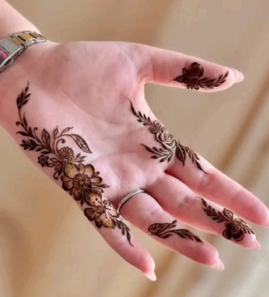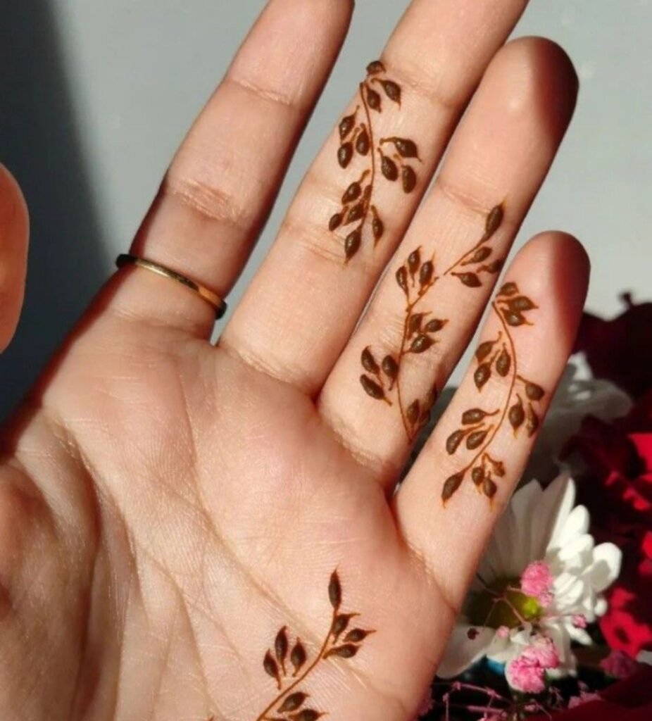 Not every occasion calls for a full back hand design  and 2026 fully validates that instinct. The micro minimalist finger vine is exactly what its name promises: a single, wandering vine of tiny leaves and dots that climbs one or two fingers, leaving the rest of the hand elegantly bare.