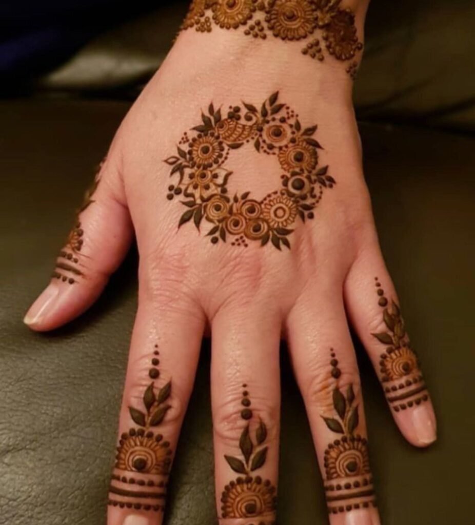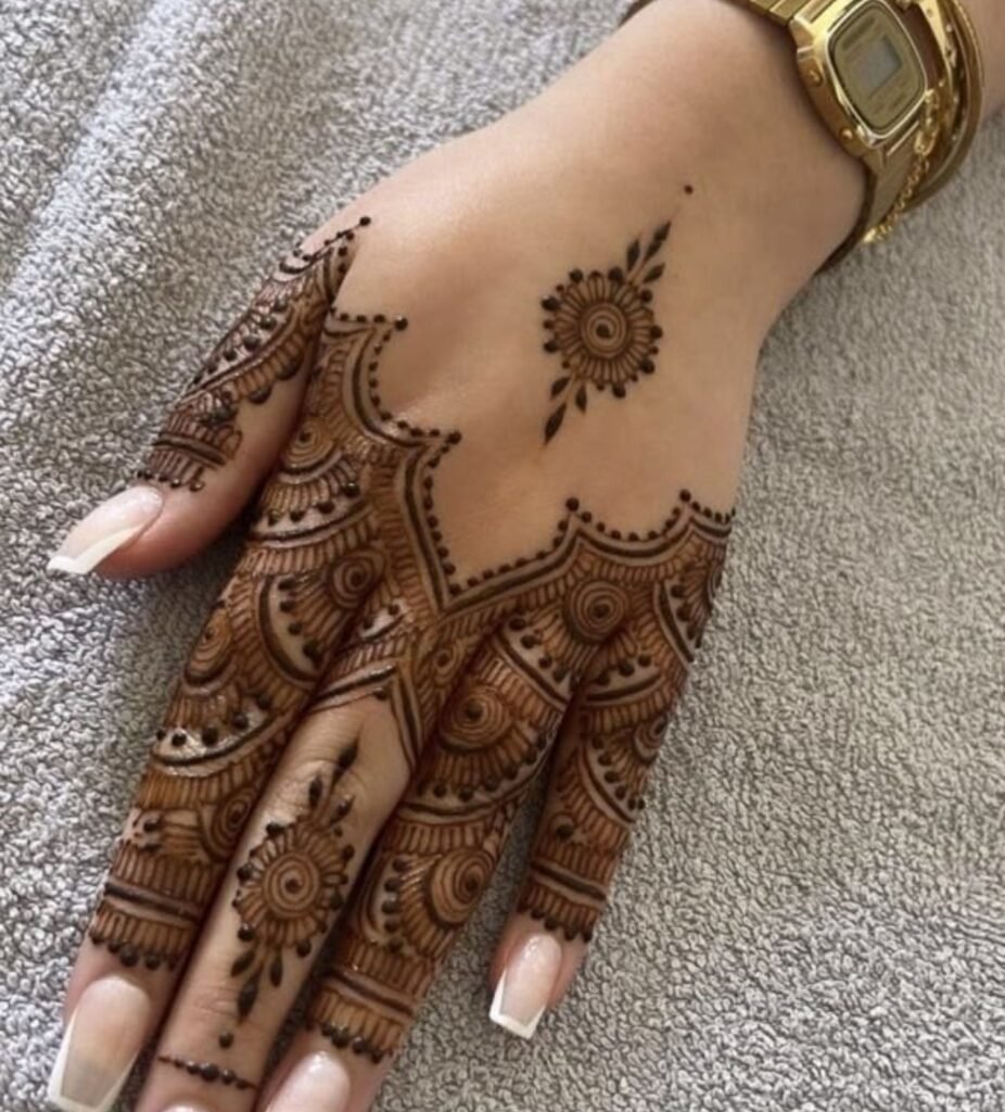 Placed centrally on the back of the hand, this design radiates outward in perfect concentric rings. Symmetrical Balance, one of 2026’s defining trends  is the ruling principle here. Every petal, every gap, every point mirrors its opposite with quiet precision.