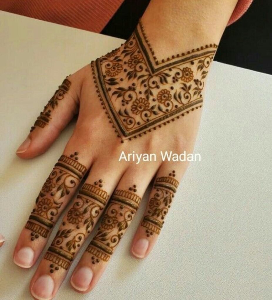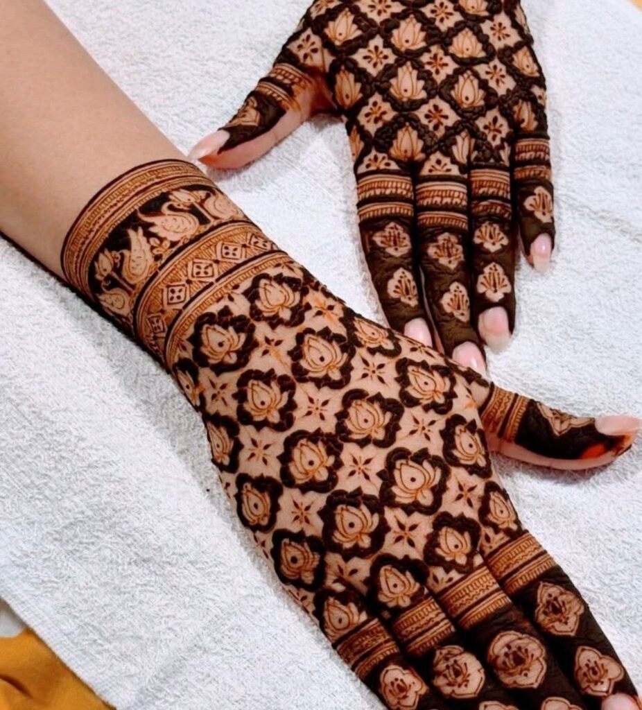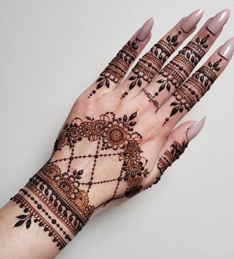 This design borrows from Moroccan tilework  interlocking diamonds, sharp chevrons, and hexagonal fills  and wraps them around the wrist like a wide cuff bracelet. The back hand mehndi designs The silhouette is bold and graphic, a striking contrast to the organic florals dominating traditional mehndi.