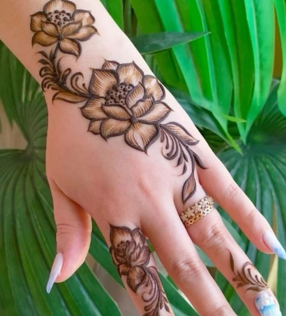 - Frame it with mehndi: Have your artist draw delicate petals or a vine that wraps around the ring finger, leaving the center slightly bare so the ring can sit cleanly.