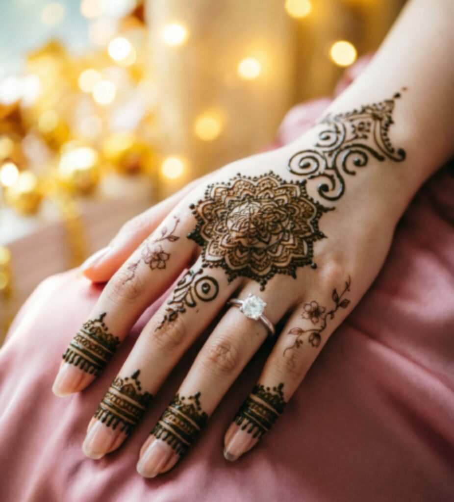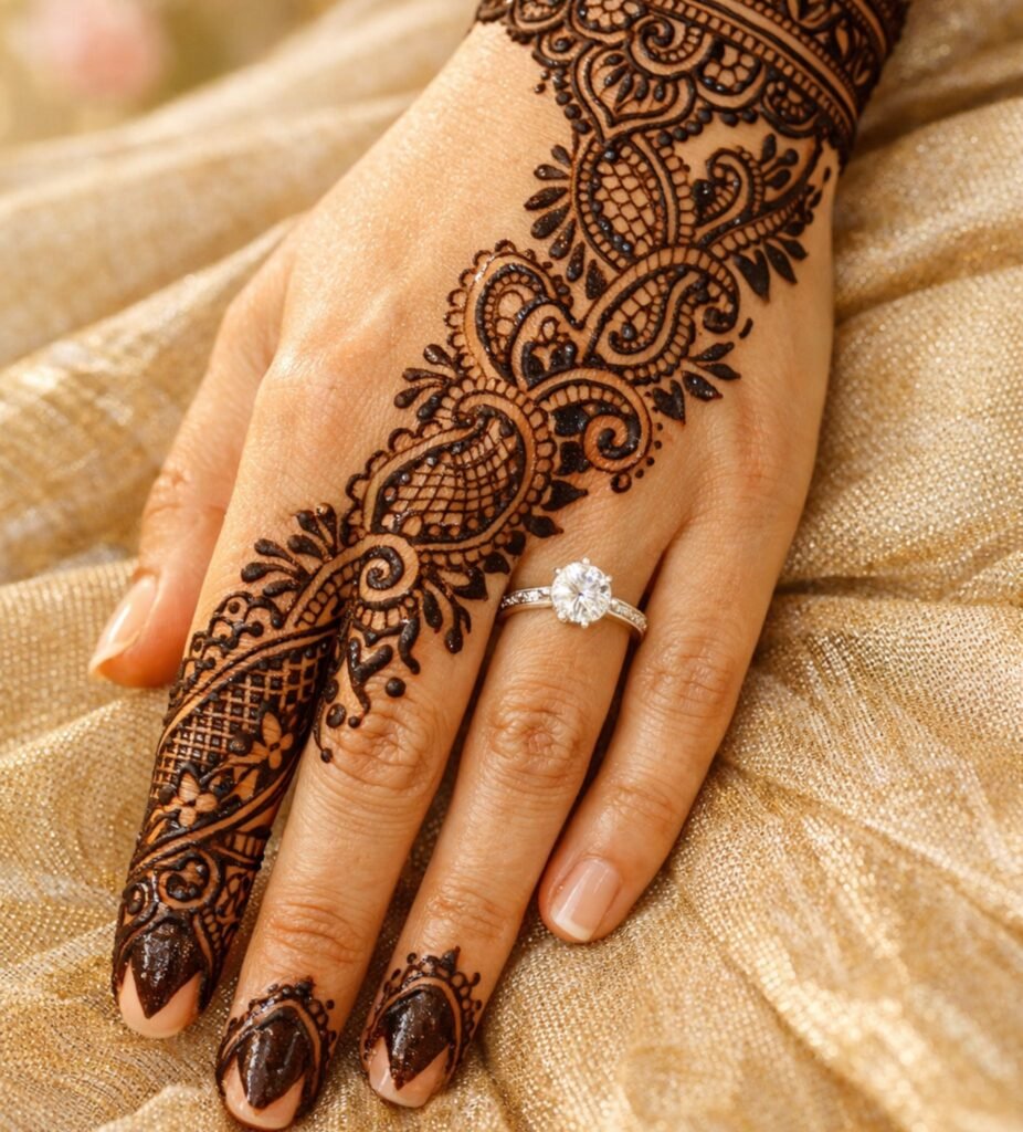 Unlike full bridal mehndi, your engagement henna needs to strike a delicate balance refined enough to complement your outfit, expressive enough to feel special, and light enough to let that ring shine.