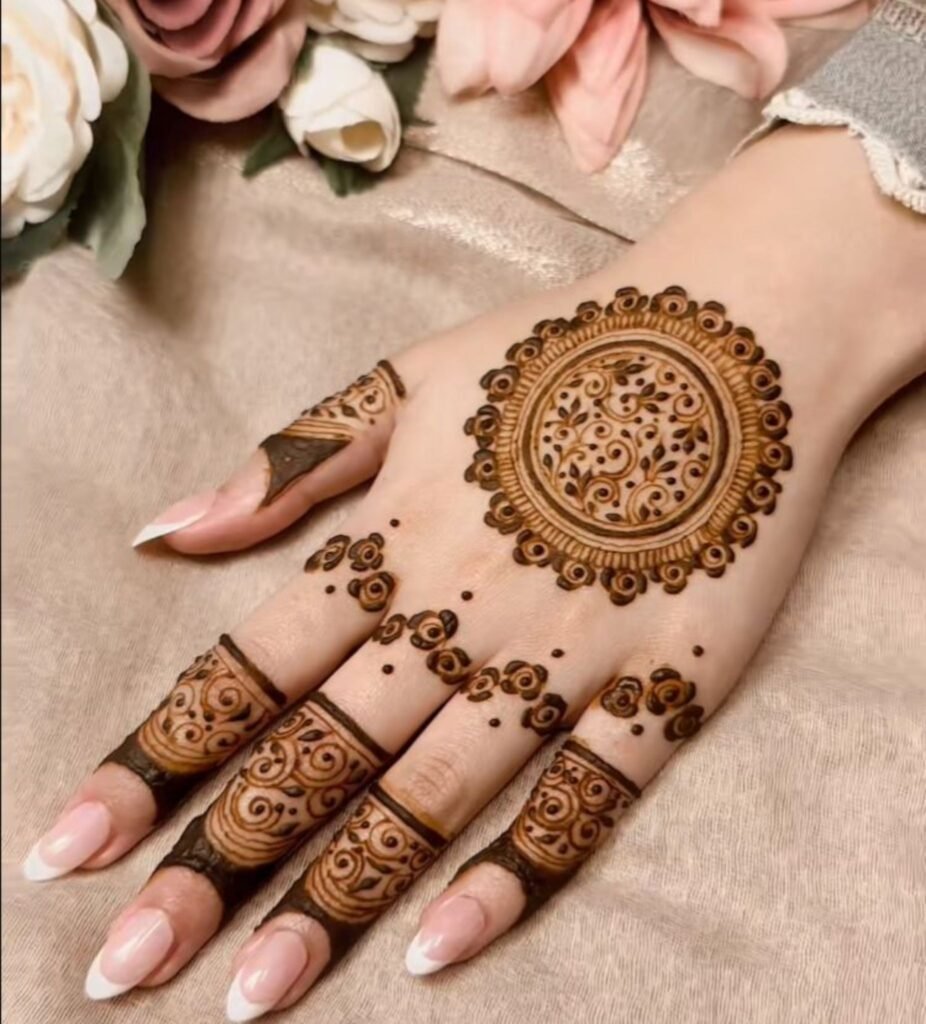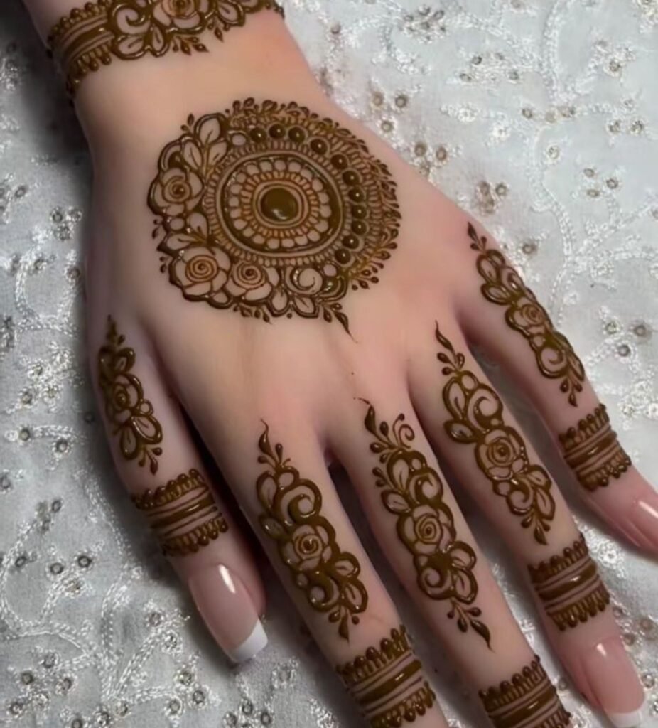A single, intricately drawn mandala on the palm is having a major moment right now. It’s meditative, artistic, and visually striking. Brides are pairing a palm mandala with bare or lightly decorated fingers to let the centerpiece breathe.