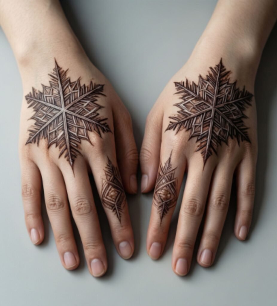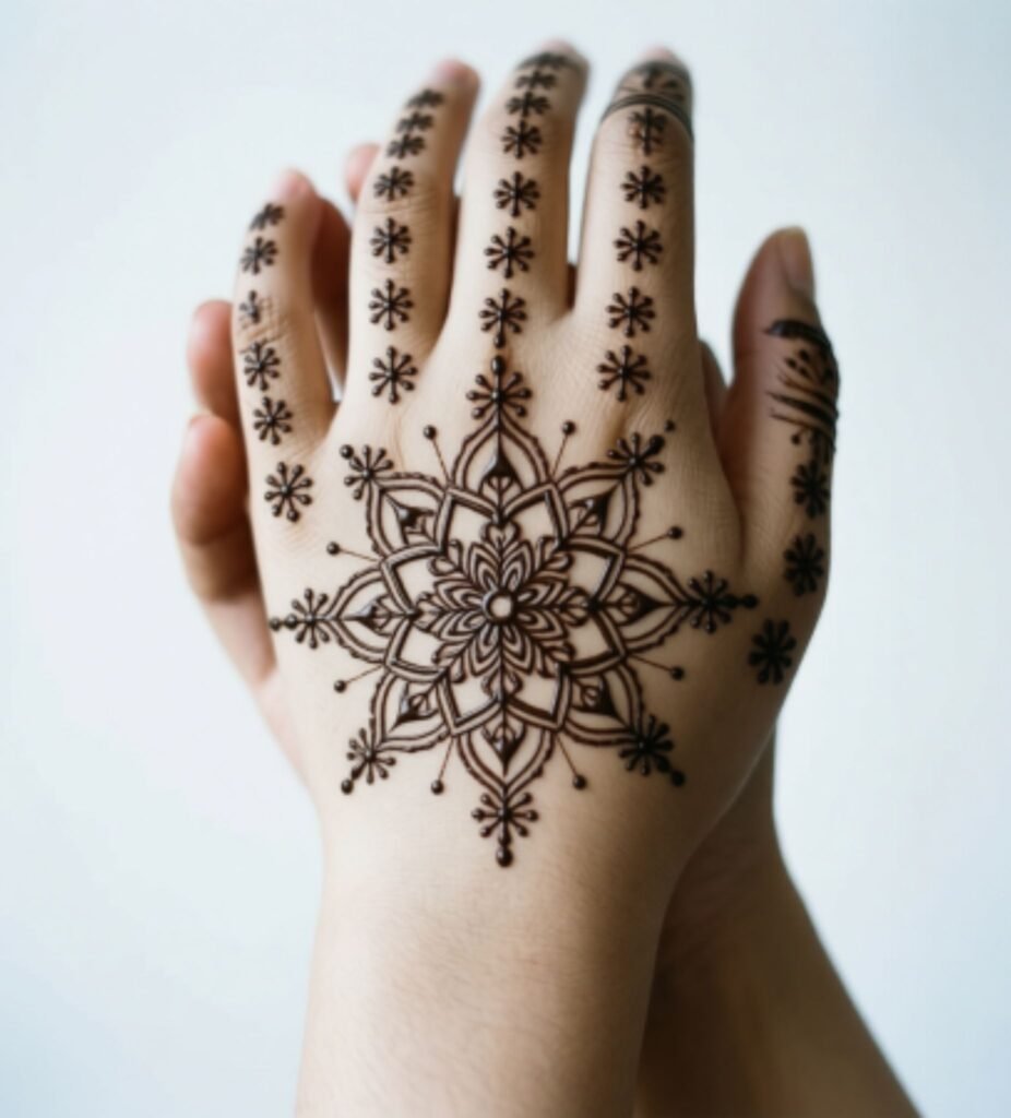 - Finishing Touch: Add white henna dots at strategic points for glistening snow effect