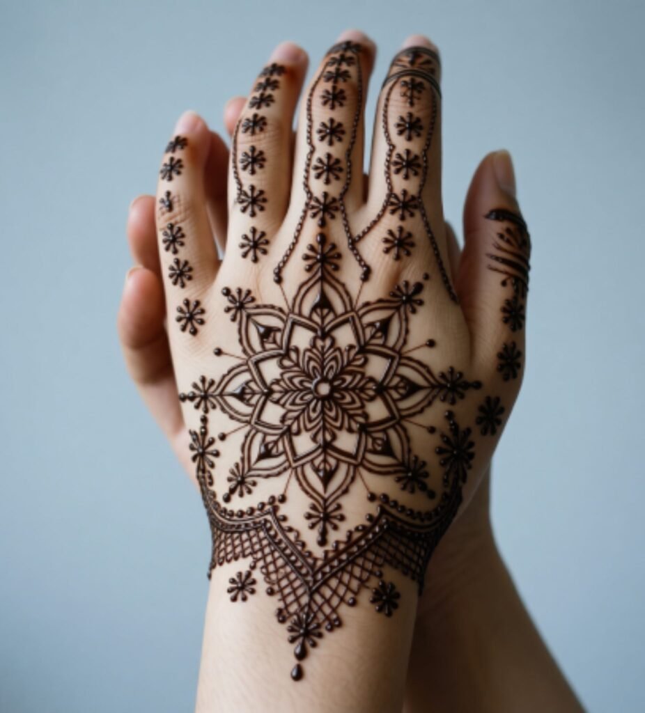 Christmas Mehndi Designs Festive Henna Transform your hands into a crystalline winter wonderland with this delicate net pattern. Each intersection becomes a unique snowflake, creating an ethereal, lace like masterpiece.