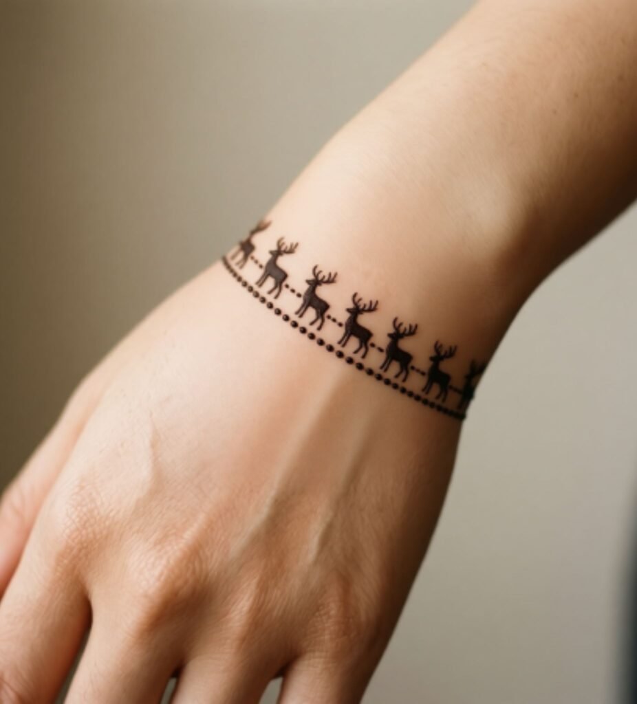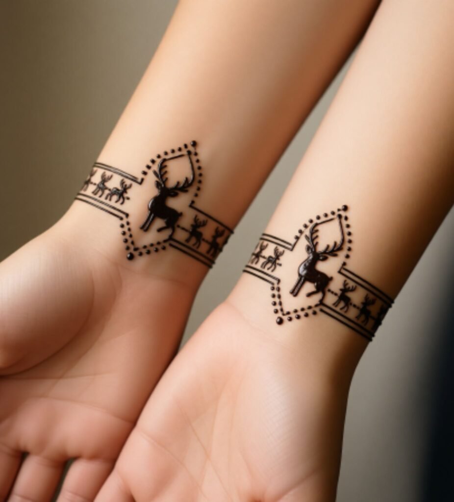 Christmas Mehndi Designs Festive Henna Playful meets sophisticated in these stunning bracelet style bands featuring Christmas’s most beloved characters. Reindeer leap across your wrists in elegant henna jewelry.