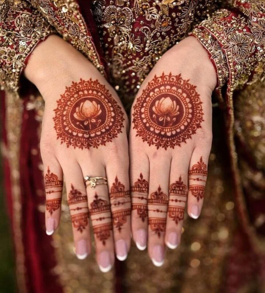 Tip: For bridesmaids, consider a single geometric circle mehndi on the wrist only that pairs beautifully with stacked rings and delicate bangles without competing with the bride’s fuller design.
