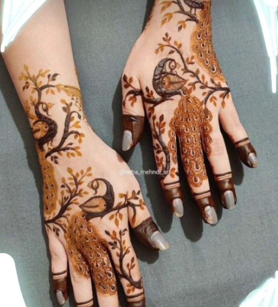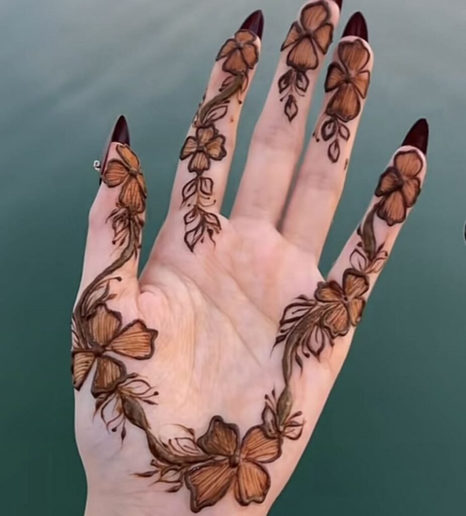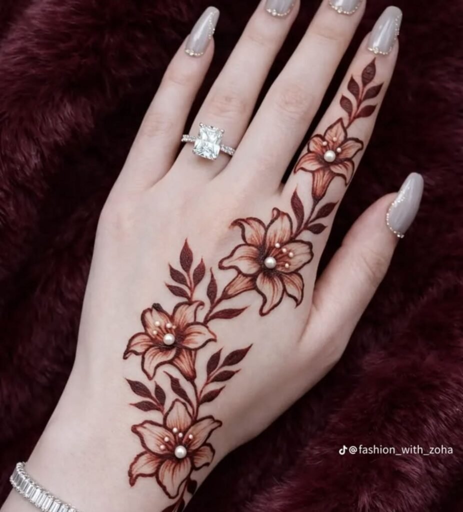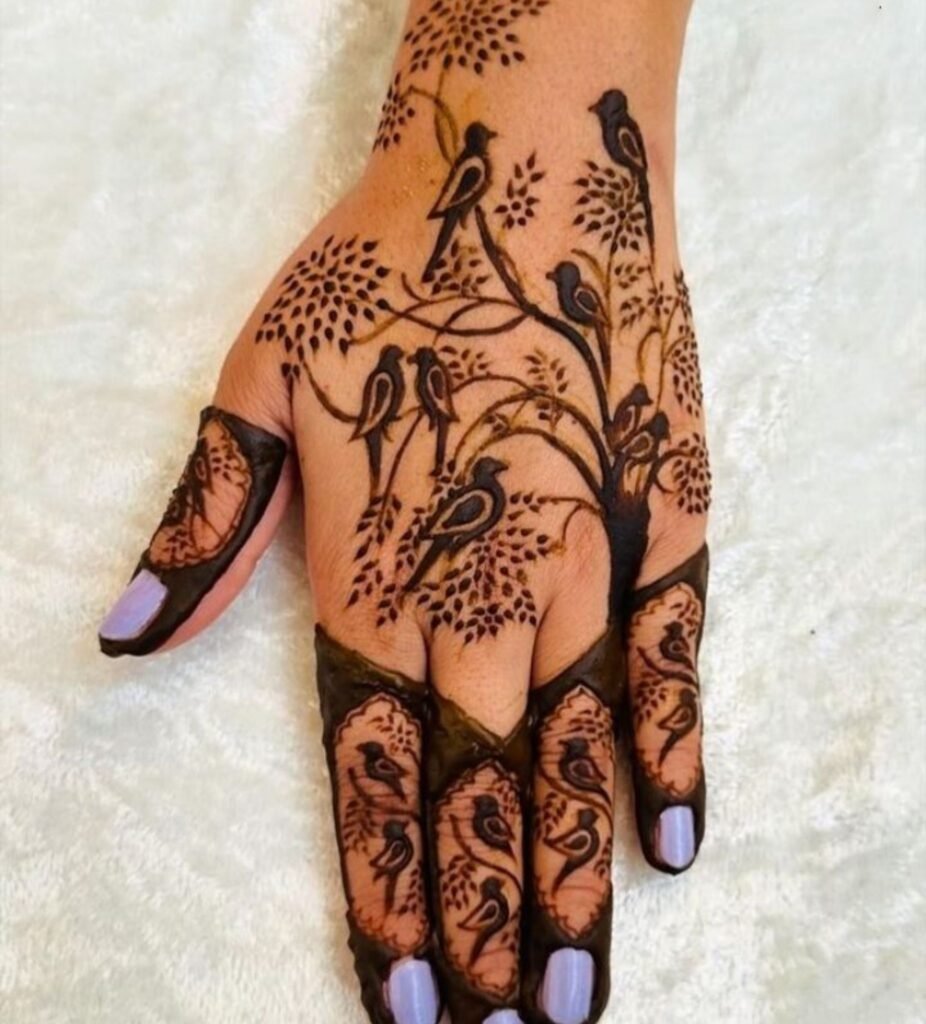 Swallows in flight, trailing moonflower vines, and anatomically precise fern fronds are replacing stylized peacocks and generic paisleys. Henna’s organic warmth ranging from terracotta to near black gives botanical motifs a depth no ink black tattoo achieves on olive or deep skin tones.