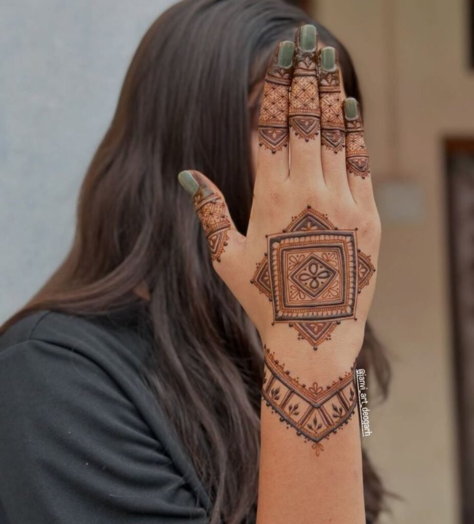 Key elements to request: isometric triangles radiating from a central lozenge, alternating filled and unfilled segments for a high contrast graphic effect, and sharp interior angles within curved outer borders; the tension between cool mehndi design geometry and organics is where the magic lives.