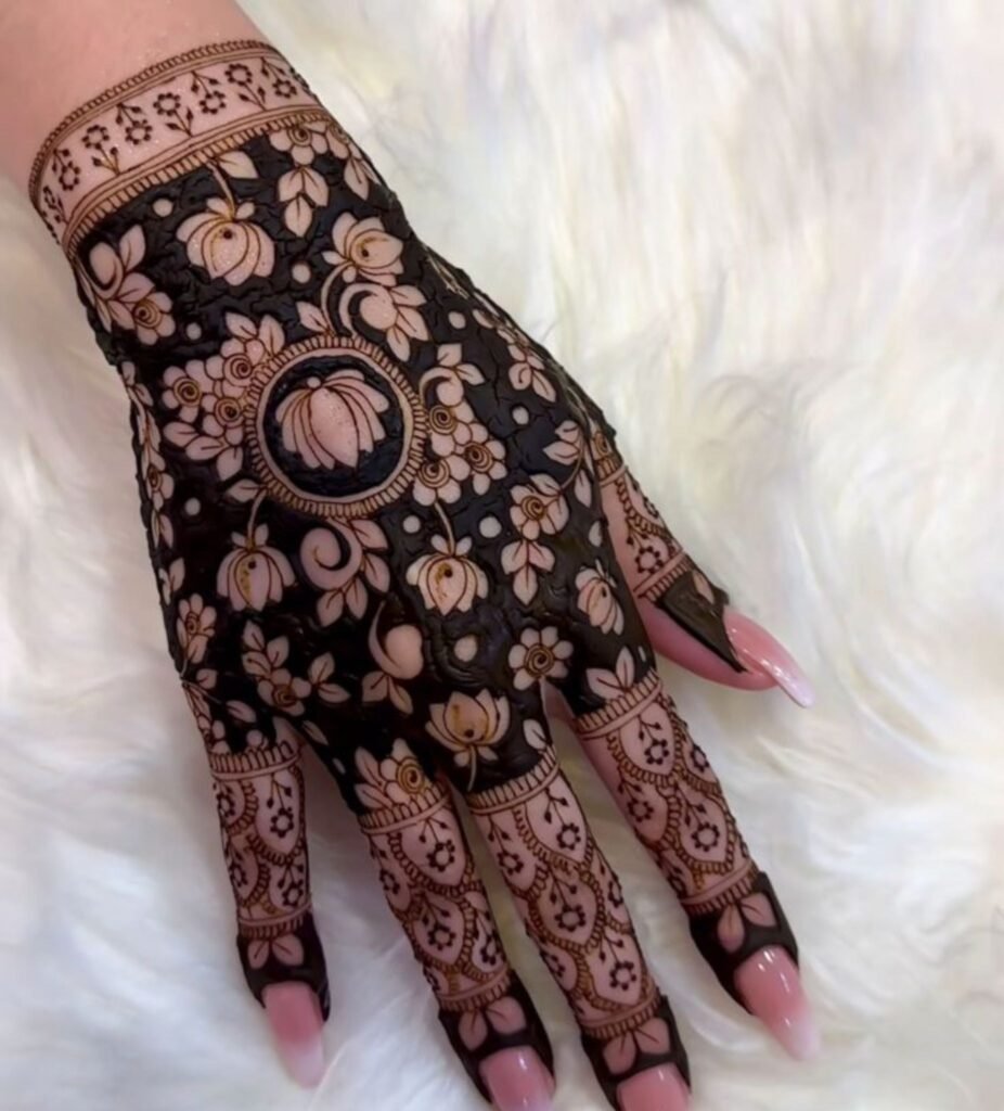 Imagine a lotus bloom whose petals are the color of your skin, framed by a dense henna field. On deeper skin tones especially, the contrast between natural pigment and darkened henna creates something genuinely striking. Motifs that work best in reverse: geometric shapes, crescent moons, five pointed stars, and simplified animal silhouettes.