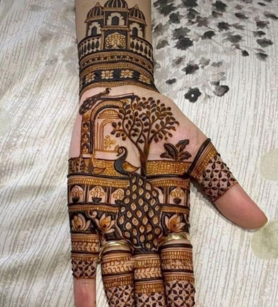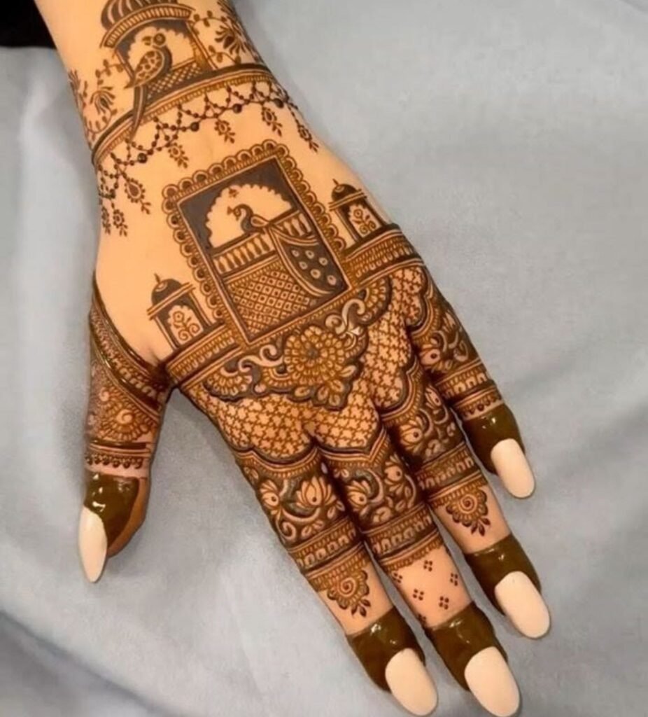This is the designer mehndi design for the bride who wants her hands to tell a story. Inspired by the grandeur of Mughal architecture, domed arches, intricate jalis, and symmetrical flora this trend takes traditional motifs and layers them with stunning 3D depth.
