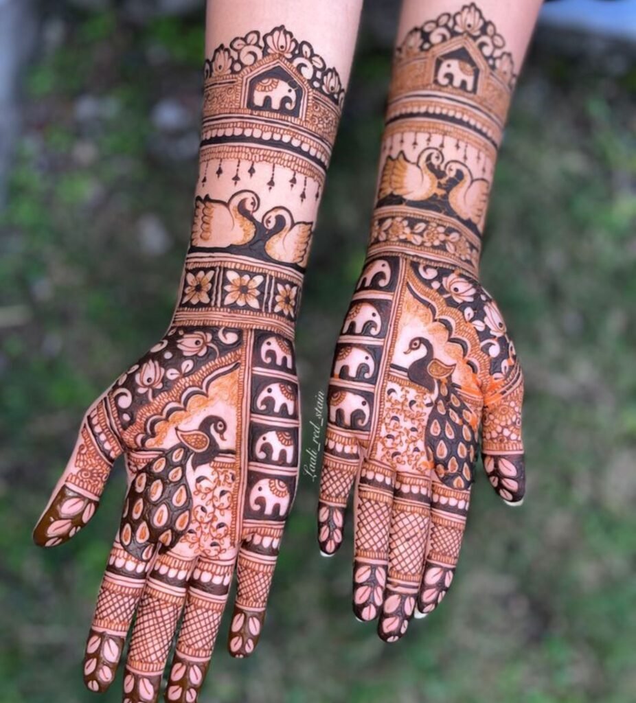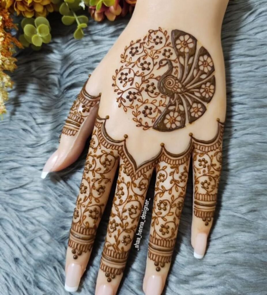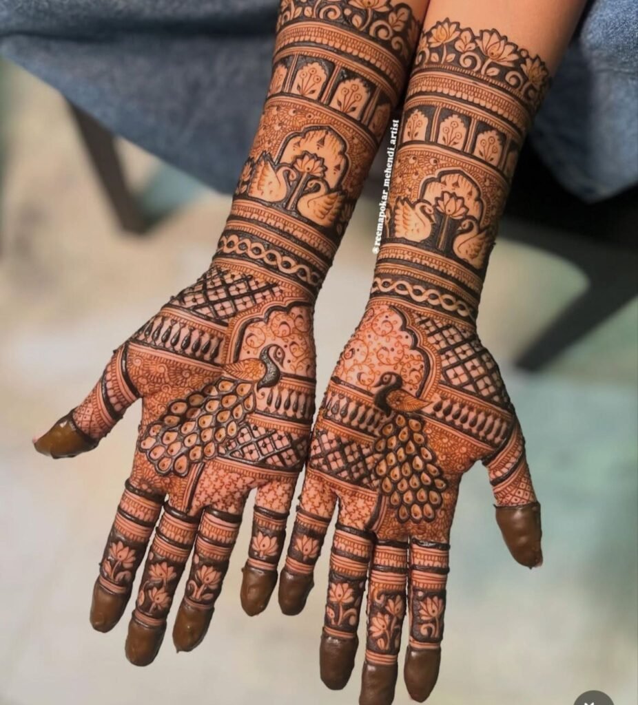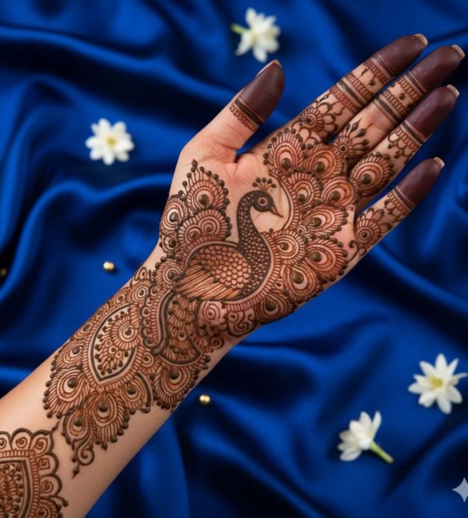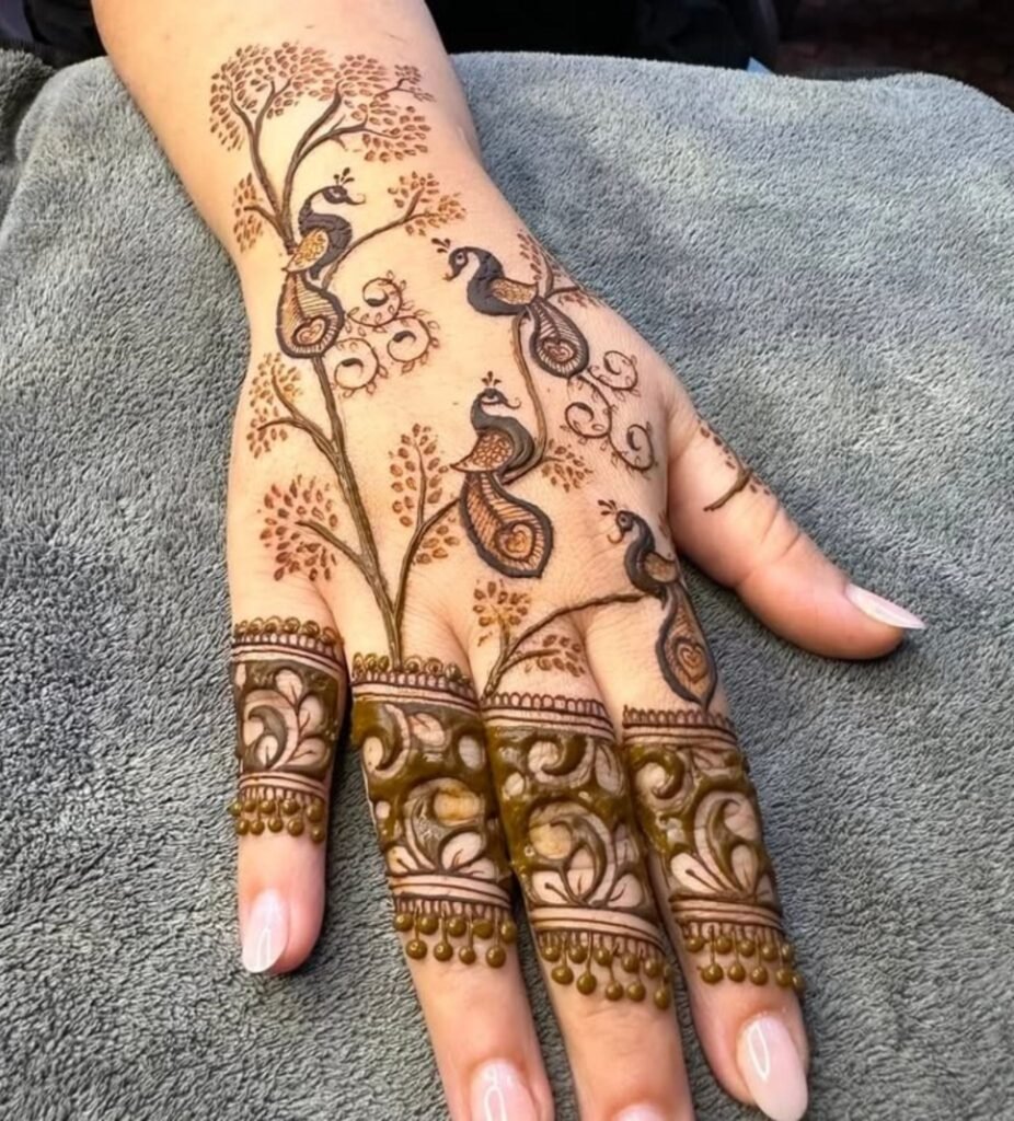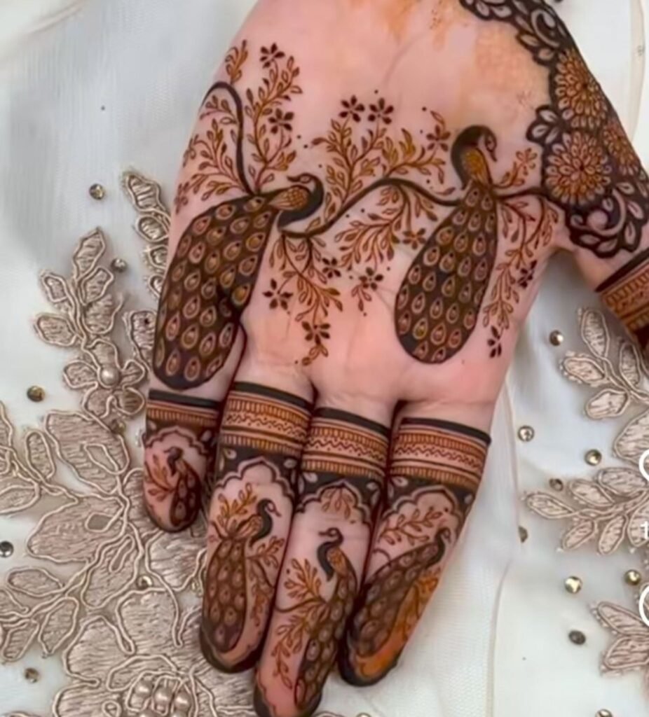 - Haath phool style: Central palm peacock connected by henna “chains” to individual finger rings