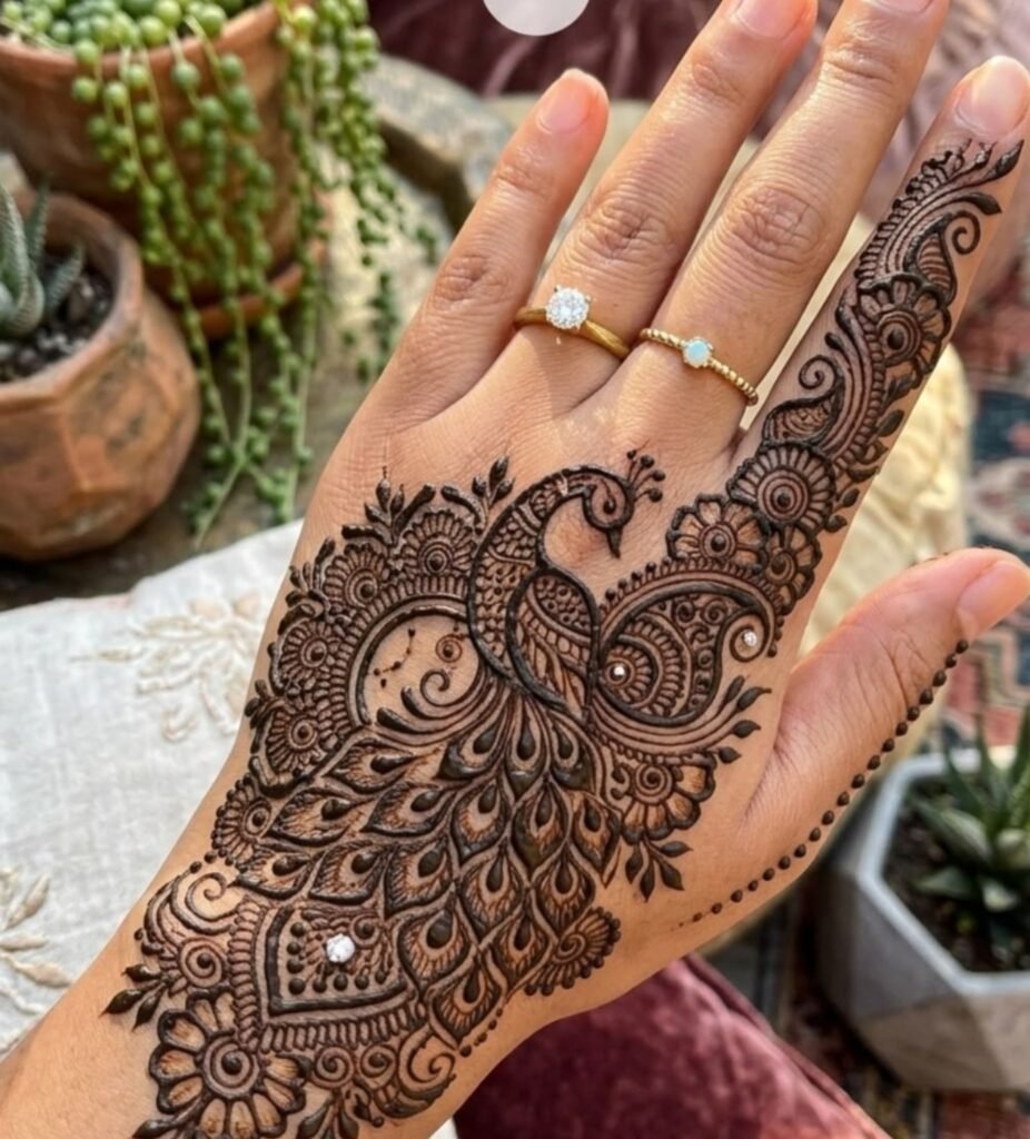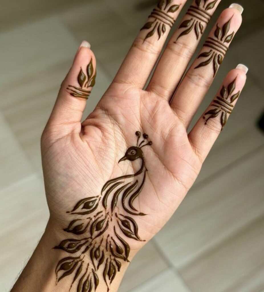 The “less is more” philosophy has fully arrived in henna. Micro peacock designs feature a single, delicately outlined peacock head just 2–3 cm across placed on the middle finger or inner wrist. The tail feathers are suggested with three or four slim curved lines rather than fully filled plumage, leaving the skin to breathe.